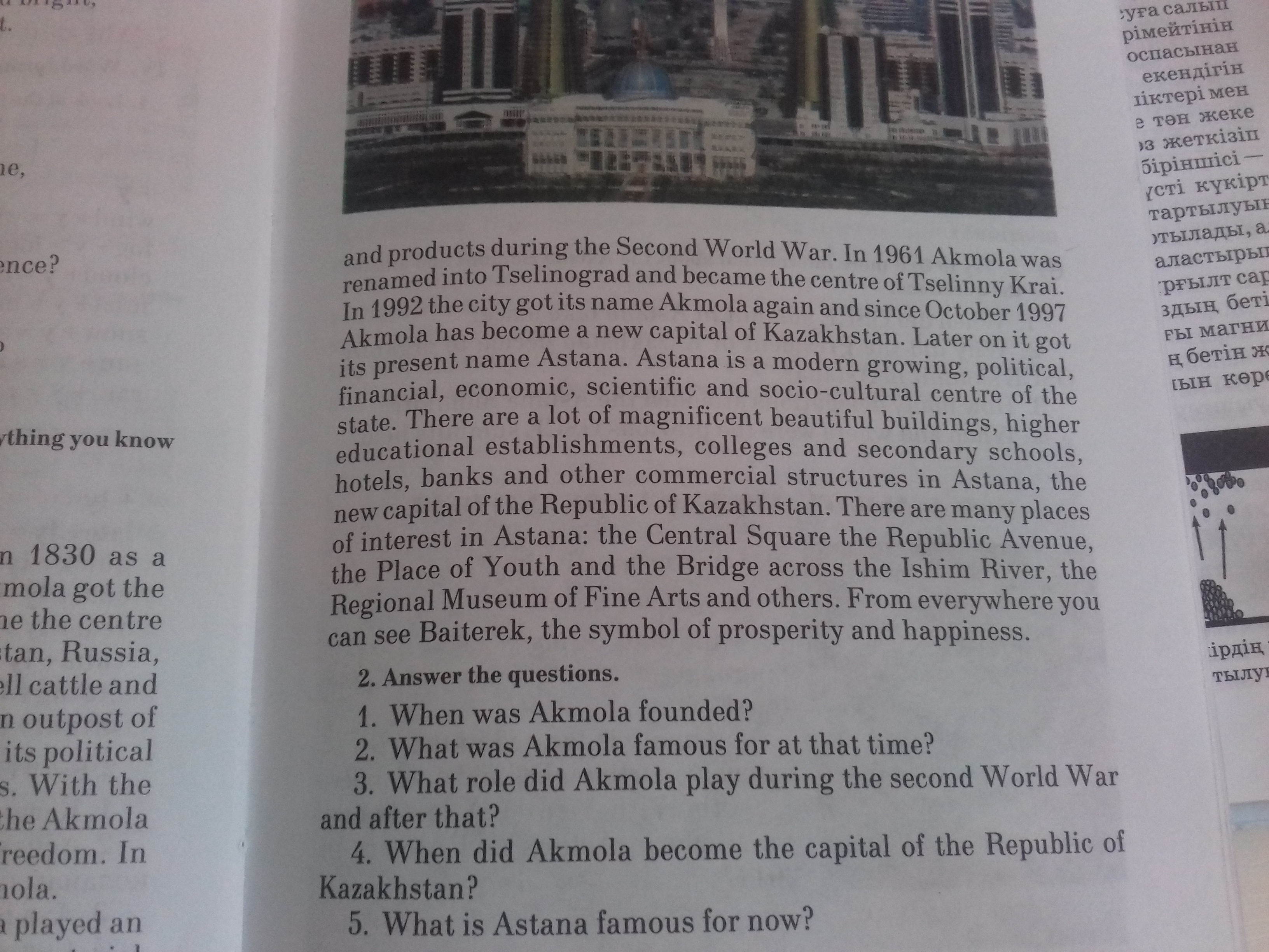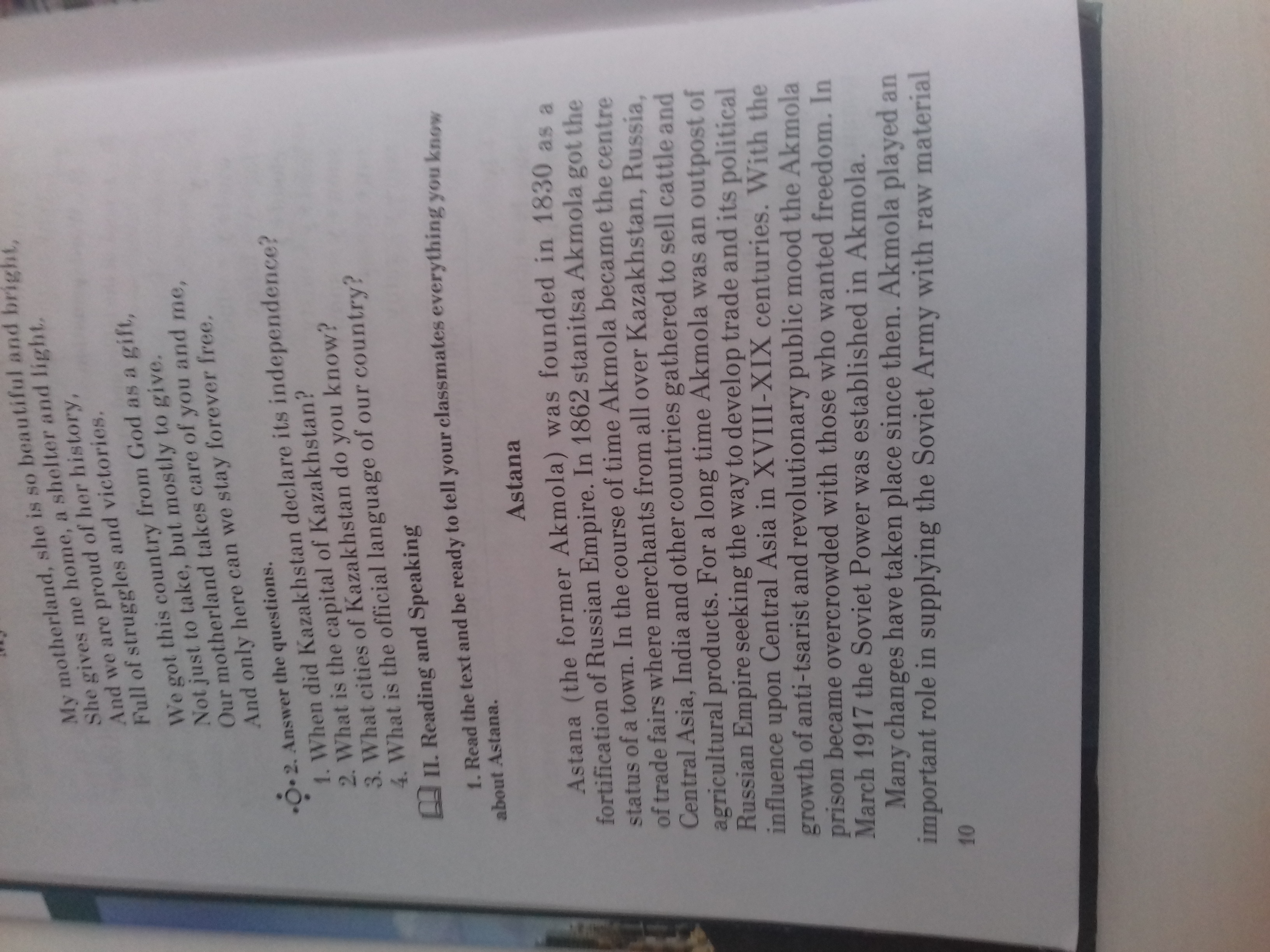 Астана Астана (бывшая Акмола) была основана в 1830 году Российской Империей. В 1862 году станица Акмола получила статус города. С течением времени Акрнола стала центром торговых ярмарок, где торговцы со всего Казахстана, России, Средней Азии, Индии и других стран собрались для продажи крупного рогатого скота и сельскохозяйственной продукции. Долгое время Акмола была форпостом Российской империи, ищущим пути развития торговли и ее политического влияния на Центральную Азию XVIII-XIX веков. С ростом и революционным общественным настроем акмолинская тюрьма переполнена теми, кто хотел свободы. В марте 1917 года Советская власть находилась в Акмоле. С тех пор произошло много изменений. Акмола сыграла важную роль в снабжении Советской Армии сырьем