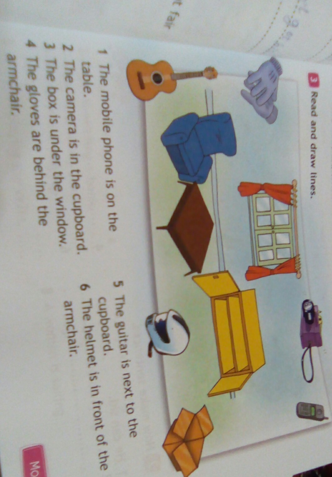 телефон на столе. фотоаппарат в шкафу. коробка под окном.перчатки за креслом.гитара рядом со шкафом.шлем перед креслом.