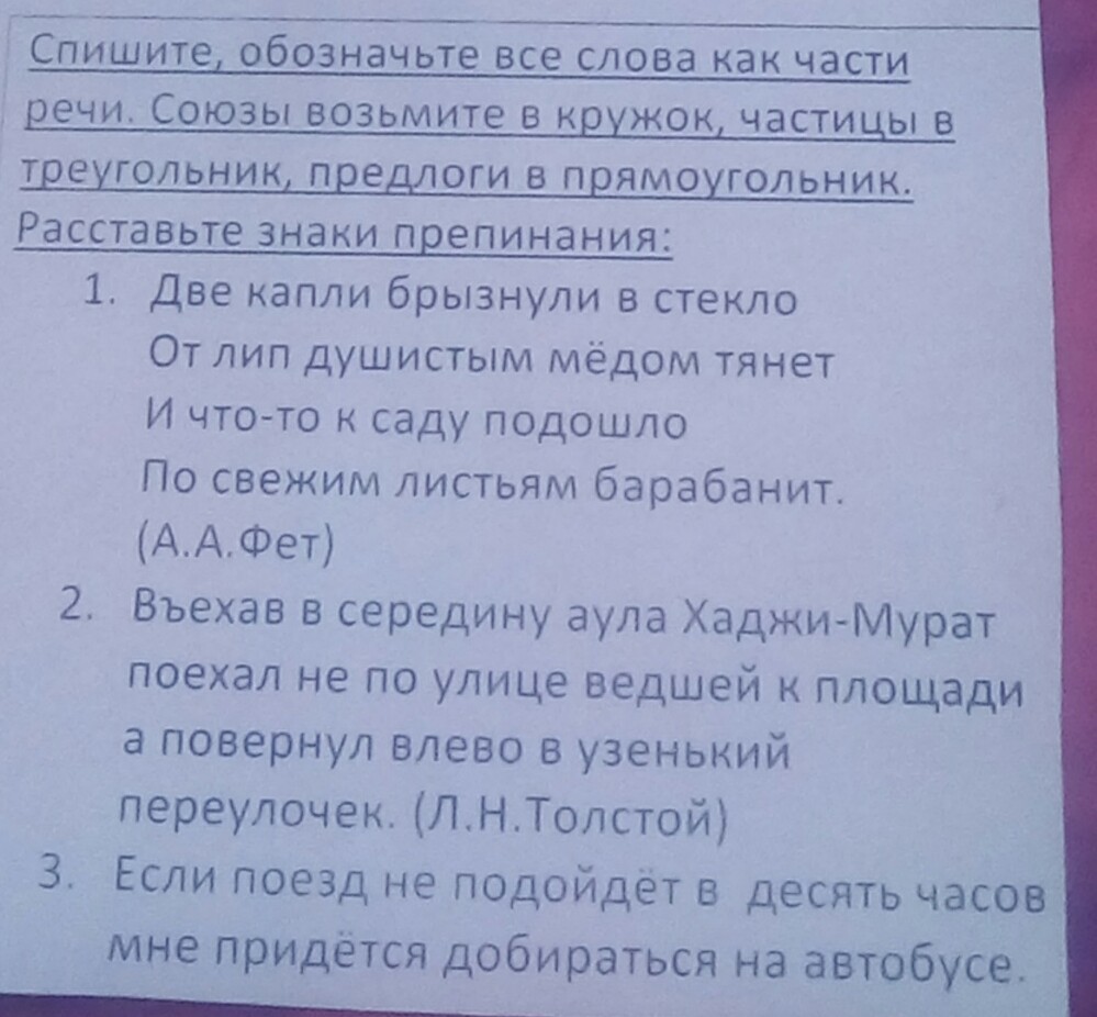 две-числит., капли-сущ., брызнули-гл., в-предлог, стекло-сущ.,от-пред., лип-сущ.,душистым-прил., мёдом-сущ., тянет-гл.,и-союз.,что- то- союз с частиц., к-пред., саду-сущ., подошло-гл., въехав-гл,.в -пред., середину- сущ.,аула-сущ., Хаджи-Мурат-сущ., поехал-гл.. не-част., по-пред., улице-сущ., ведшей-причаст., к-предл., площади-сущ., а-союз, повернул-гл., влево-нареч., в-пред., узенький-прил., переулочек-сущ., если-союз, поезд-сущ., не-част., подойдет-гл., в-пред,, десять-числ., часов-сущ., мне-местоим., придётся-гл., добираться-гл., на- пред., автобусе-сущ..