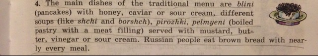 4 Главные блюда традиционного меню блины с мёдом, икра , разные супы ( щи и борщ), пирожки, пельмени (варённое тесто с мясной начинкой) подаётся с горчицой, маслом, уксусом или сметаной. Русские люди едят чёрный хлеб почти с каждой едой.