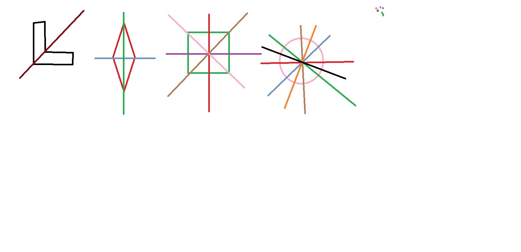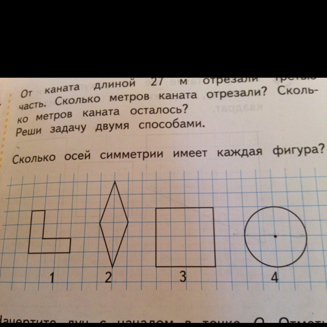 1 фигура-1 ось симметрии,2 фигура 2 оси симметрии, квадрат 4 оси симметрии,круг-множество осей симметрии
