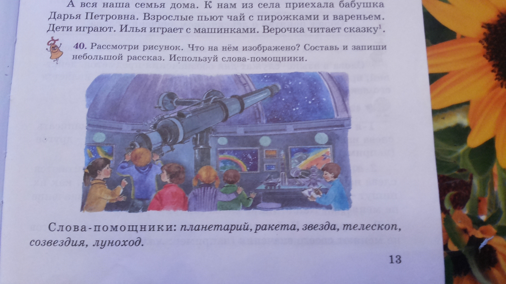 Ученики классом пошли на экскурсию в планетарий. Там они через телескоп могли увидеть звезды и созвездия, а так же в планетарии было много чего интересного, в том числе игрушечные ракеты и луноходы.