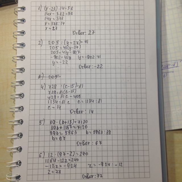 Решите уравнения1) (х-23)•14=56 2)205:(у-27)=41 3)205:(у-27=41 4)729:(с-15)=81 5)89•(b+13)=7120 6)12·(97-z)=240