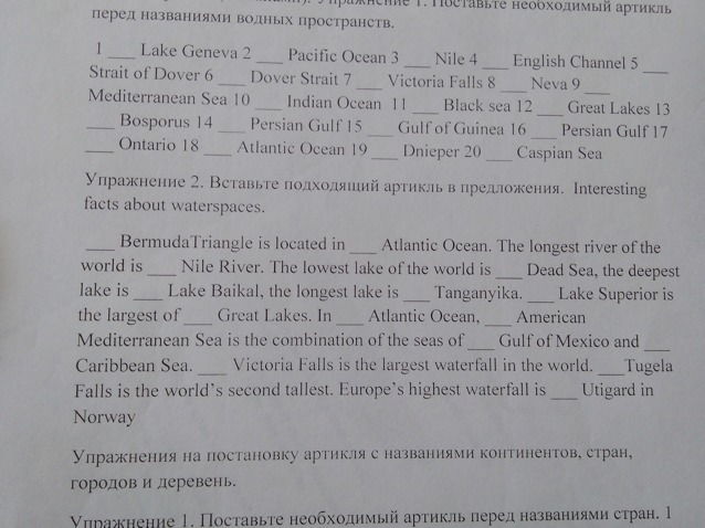 The Bermuda Triangle is located in the Atlantic Ocean. The longest river of the world is the Nile River. The lowest lake of the world is the Dead Sea , the deepest lake is Lake Baikal, the longest lake is the Tanganyka. Lake Superior is the largest of the Great Lakes. In the Atlantic Ocean, the American Mediterranean Sea is the combination of the Gulf of Mexico and the Caribbean Sea. Victoria Falls is the largest waterfall in the world. Tugela Falls is the world's second tallest. Europe 's highest waterfall is Utigard in Norway.