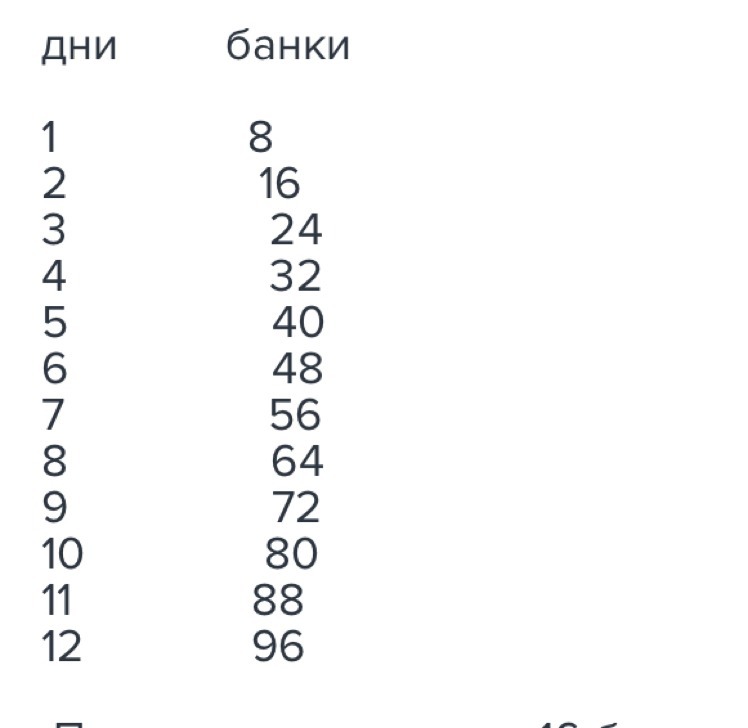Помогите составить таблицу к задаче и заполнить ее.Для похода туристы закупили 96 банок консервов. В день они расходовали по 8 банок.Сколько банок консервов у них останется после 10 дней похода?Решение не нужно только таблицу