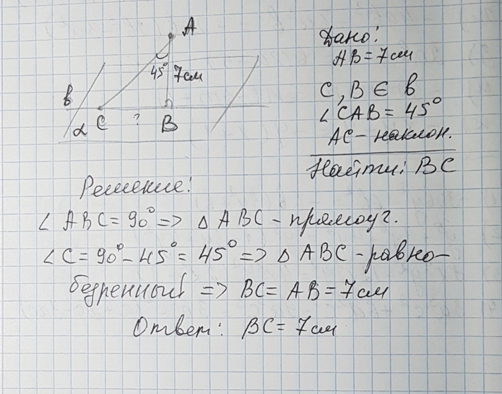 Из точки А удаленной от прямой b на расстояние 7 см проведены к ней перпендикуляр ABи наклонная AC (B и C принадлежит прямой b)