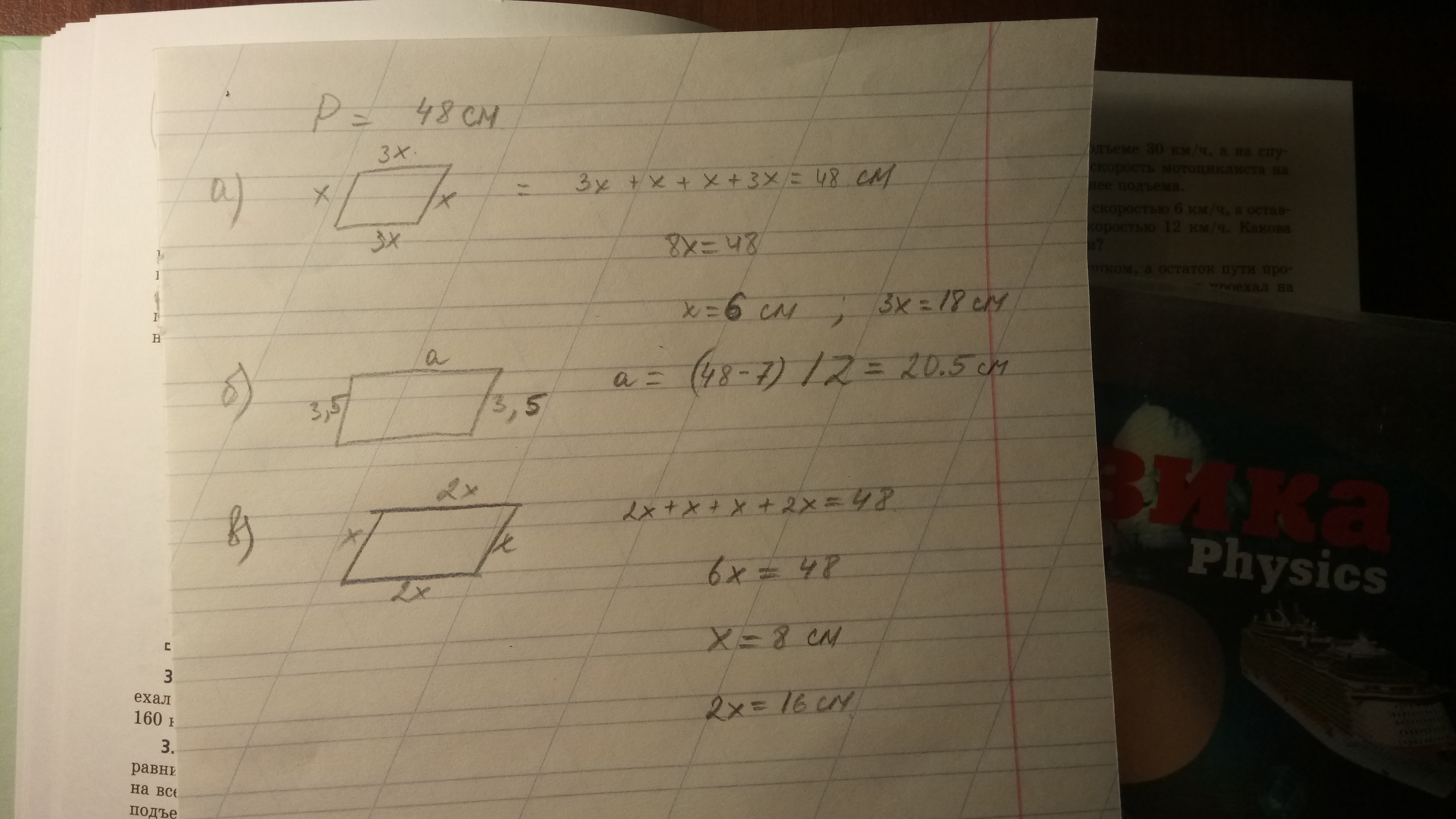 Периметр параллелограмма равен 48 см.Найдите стороны параллелограмма , если а) одна сторона в 3 раза больше другой б)сумма двух сторон 7 см в)одна из сторон в 2 раза меньше другой