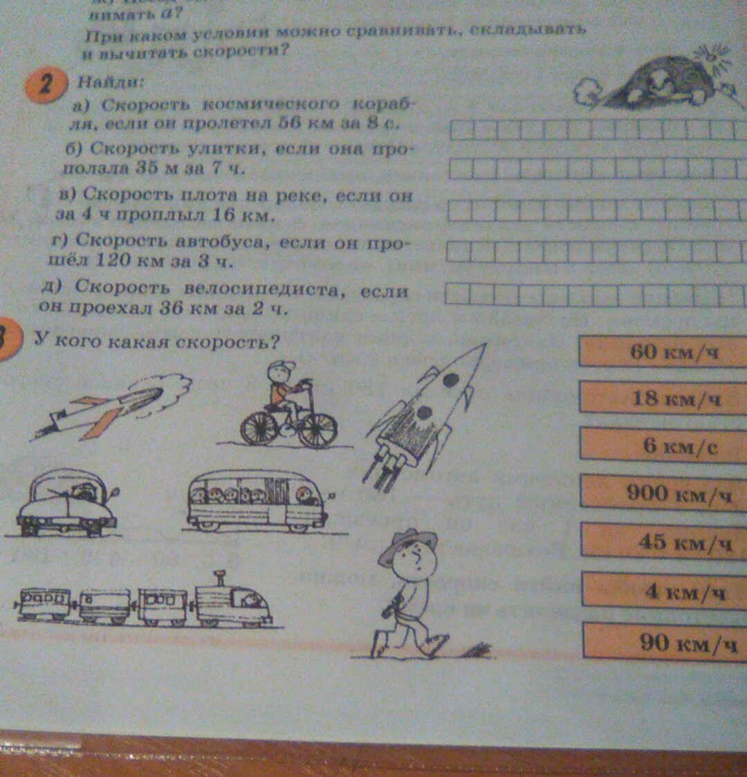 Найди а) Скорость космического корабля, если он пролетел 56км за 8 с. б) Скорость улитки, если она проползла 35 м за 7 что. в) Скорость пилота на реке, если он за 4 ч поплыл 16 км. г) Скорость автобуса, если он пришёл 120 км за 3 ч. д) Скорость велосипедиста если он проехал 36 км за 2 ч. У кого какая скорость?
