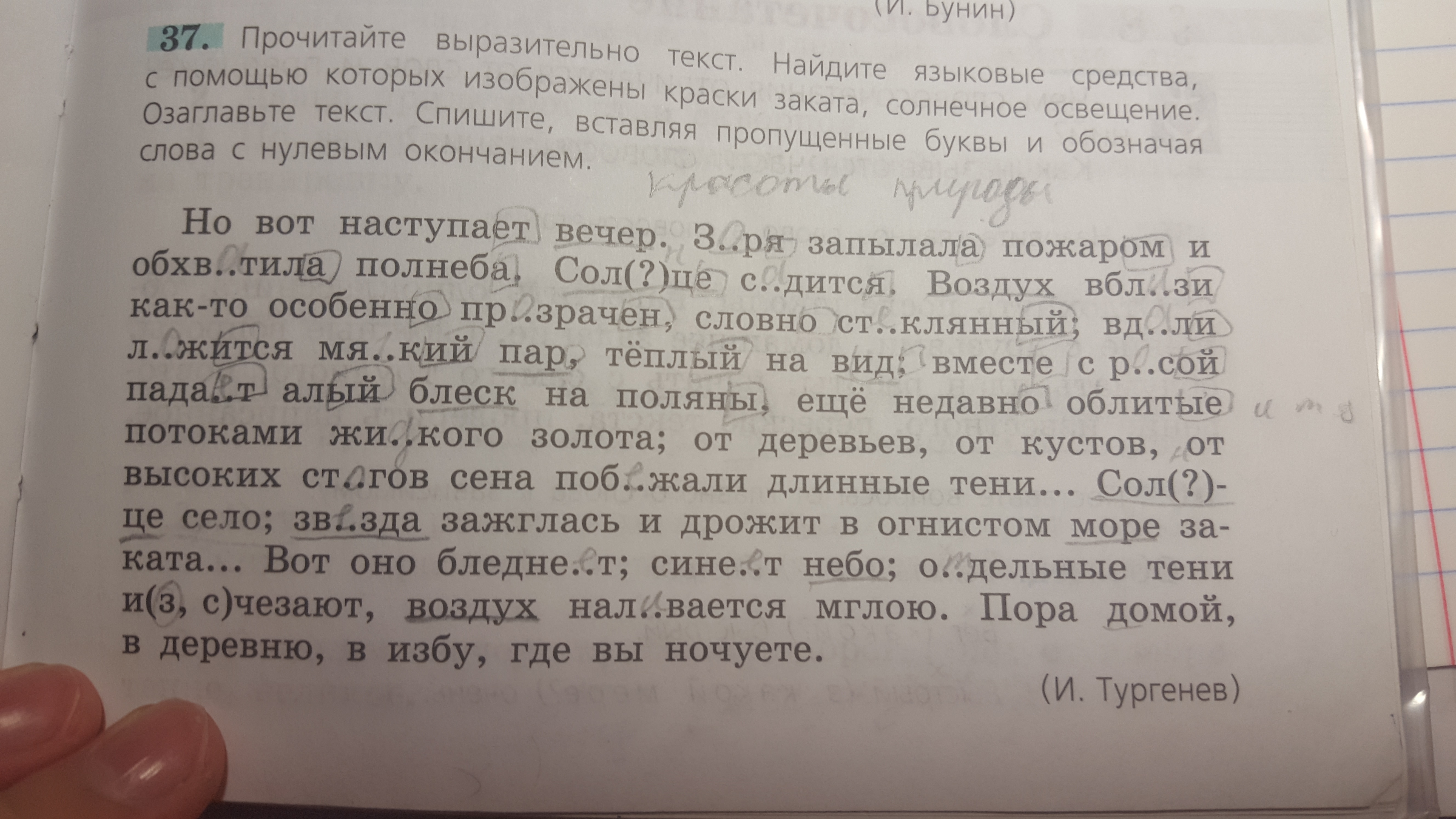 Запылала пожаром, обхватила полнеба, воздух прозрачен, стеклянный воздух, вдали ложится, мягкий пар, тёплый на вид, вместе с росой, алый блеск, блеск на поляне, облитые потоками, жидкого золота, от высоких стогов сена, длинные тени, в огнистом море заката, отдельные тени, наливается мглою, пора домой, пора в деревню, пора в избу.