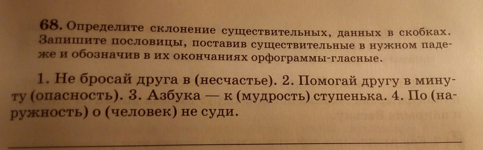 Не бросай друга в несчастьЕ.(2 скл.).Помогай другу в минуту опасностИ(3 скл.).Азбука-к мудростИ(3 скл.) ступенька.По наружностИ(3 скл.) о человекЕ (2 скл.) не суди.