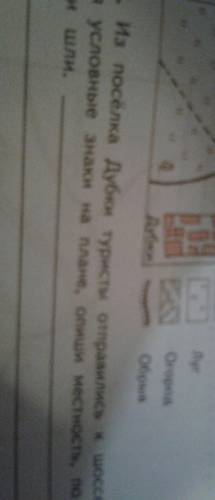 Из поселка Дубки туристы отправились к шоссе.Используя условные знаки на плане,опиши местность,по которой они шли.