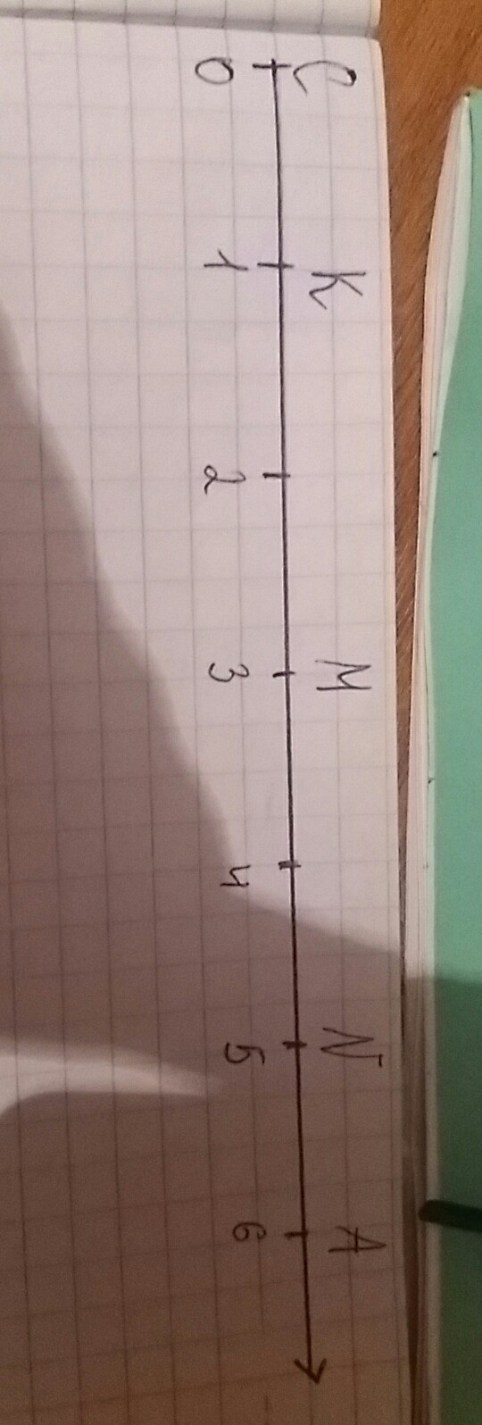 Начертите координатный луч. Отметьте точки K(1), M(3), N(5), A(6), C(0), приняв за единичный отрезок четыре клетки.