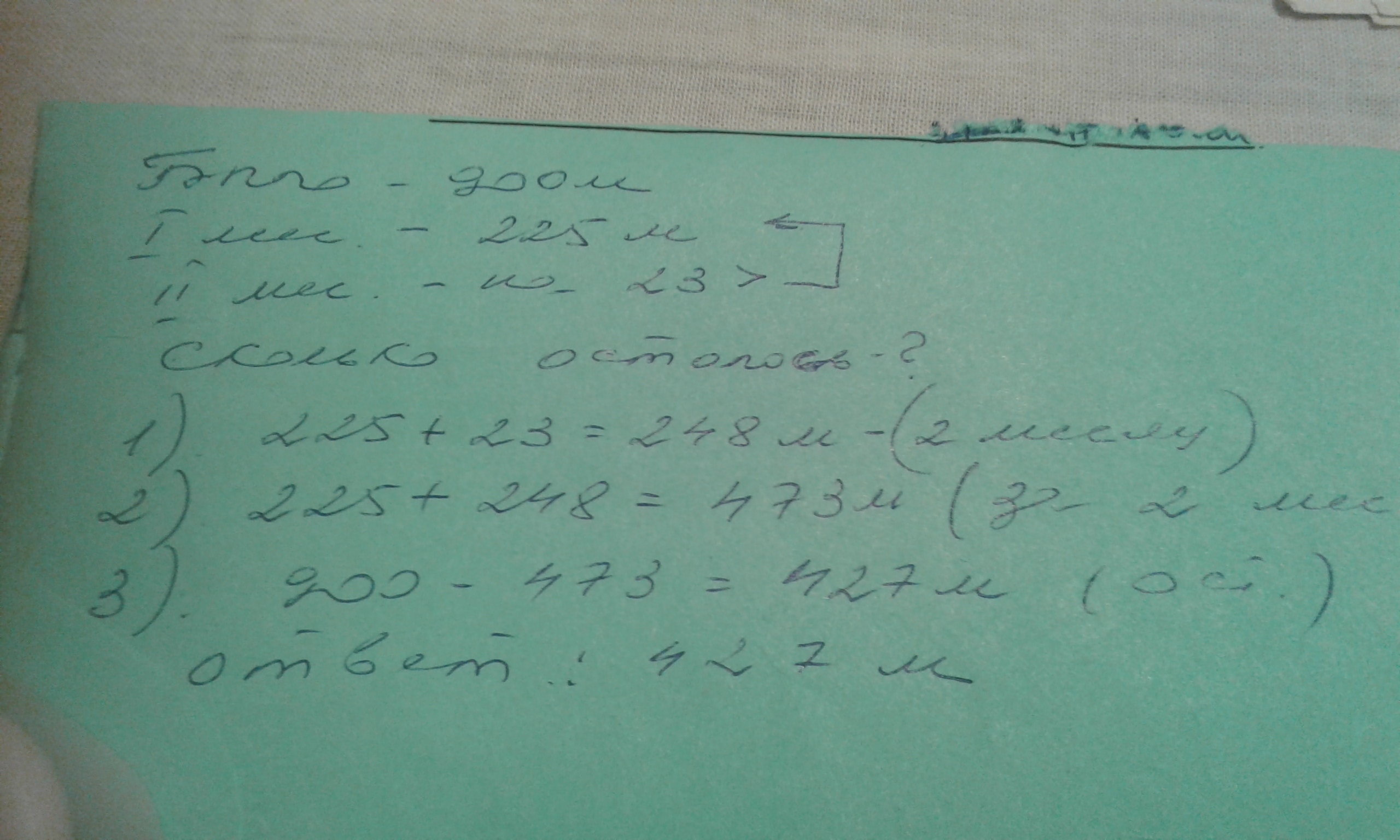 900-225=675 м ткани осталось к концу первого месяца225+23=248 м ткани израсходовали за 2-й месяц675-248=427 м ткани осталось к концу 2-го месяцаОтвет 427 м