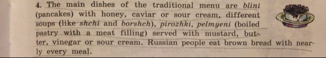 4 Главные блюда традиционного меню блины с мёдом, икра , разные супы ( щи и борщ), пирожки, пельмени (варённое тесто с мясной начинкой) подаётся с горчицой, маслом, уксусом или сметаной. Русские люди едят чёрный хлеб почти с каждой едой.