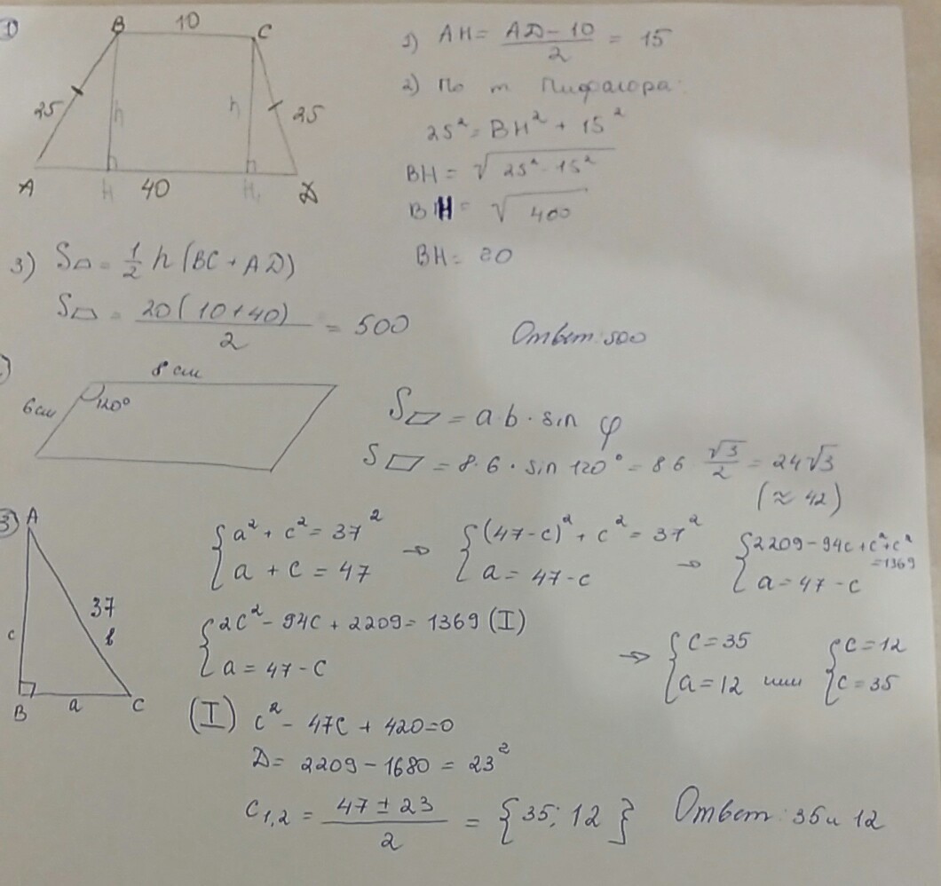 1. В равнобокой трапеции основания равны 10 см и 40 см, боковая сторона 25 см. Найдите площадь трапеции. (ответ должен быть 500 )