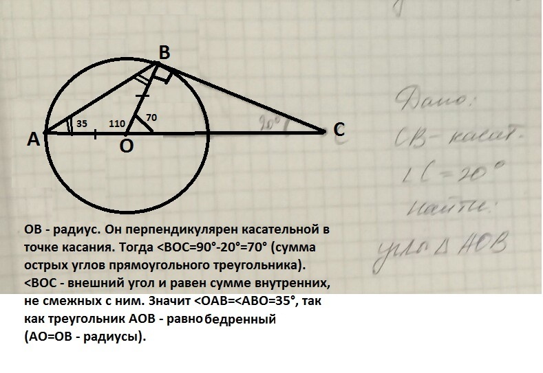 ОВ - радиус. Он перпендикулярен касательной в точке касания. Тогда <BOC=90°-20°=70° (сумма острых углов прямоугольного треугольника). <BOC - внешний угол и равен сумме внутренних, не смежных с ним. Значит <OAB=<ABO=35°, так как треугольник АОВ - равнобедренный (АО=ОВ - радиусы).