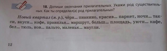 Черное пианино (ср.р), красивый паркет (м.р.), ночное такси (ср.р.), вкусный кофе (м.р.), правильный маршрут (м.р.), большая площадь (ж.р.), уютное кафе (ср.р), белый тюль (м.р.), новое пальто (ср.р.), маленький маугли (м.р.)