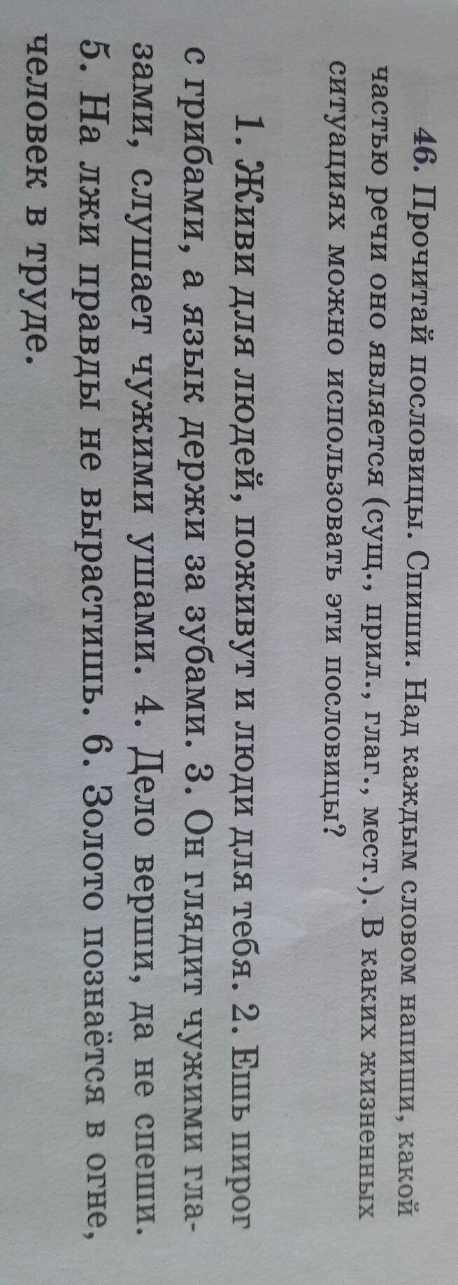 1.Живи (глаг.) для людей (сущ.), поживут (глаг.) и люди (сущ.) для тебя (мест.). 2.Ешь (глаг.) пирог (сущ.) с грибами (сущ.), а язык (сущ.) держи (глаг.) за зубами (сущ.). 3.Он (мест.) глядит (глаг.) чужими (прил.) глазами (сущ.), слушает (глаг.) чужими (прил.) ушами (сущ.). 4.Дело (сущ.) верши (глаг.), да не спеши (глаг.). 5.На лжи (сущ.) правды (сущ.) не вырастишь (глаг.). 6.Золото (сущ.) познается (глаг.) в огне (сущ.), человек (сущ.) в труде (сущ.).