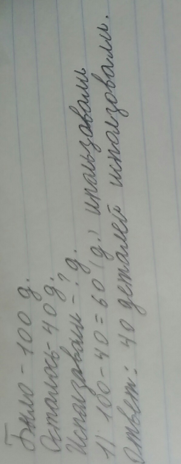 как составить условие к задачи. в наборе 100 деталей.после составления узора осталось 40. сколько деталей использовали для составления узора