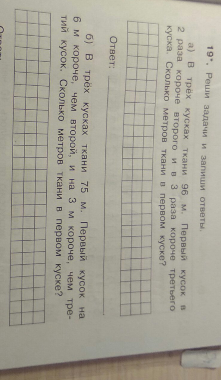 реши задачи и запиши ответы в 3 кусках ткани 96 метров Первый кусок в 2 раза короче второго и в три раза короче третьего куска сколько метров ткани в первом куске вдруг кусках ткани 75 метров Первый кусок на 6 метров короче чем второй и на 3 м короче чем 3 кусок Сколько метров ткани в первом куске
