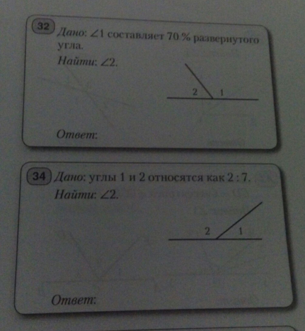 Вторую задачу сначала не очень поняла, но если эти углы смежные, то пусть х - коэффициент отношения, тогда ∠1=2х, ∠2=7х. Сумма смежных углов, как известно, равна 180°. Тогда: