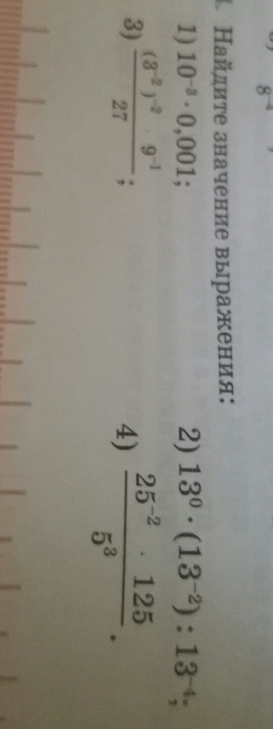 2)13⁰ * (13⁻²) : 13⁻⁴ = 13⁰⁻²⁻⁽⁻⁴⁾ = 13⁻²⁺⁴ = 13² = 169