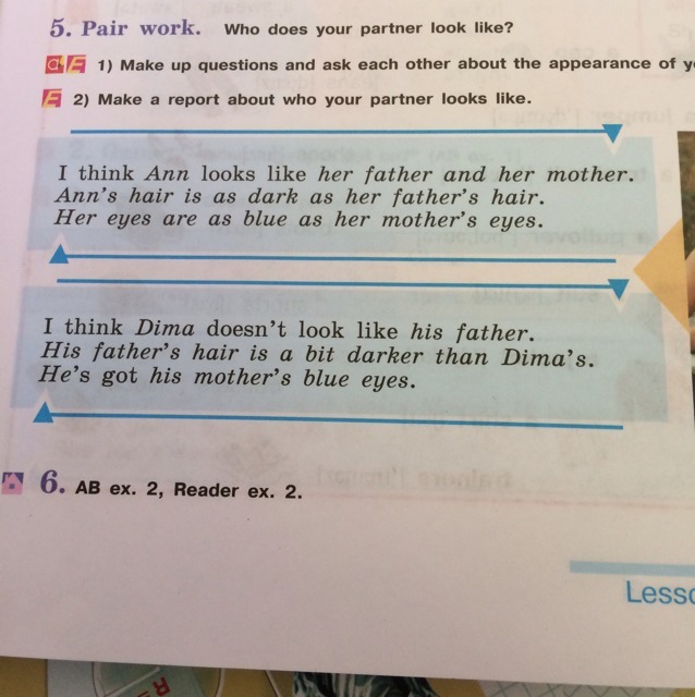 Я думаю, Ann похожа на её папу и маму. Волосы Ann такие же тёмные, как волосы её отца. Её глаза такие же голубые, как глаза её мамы.