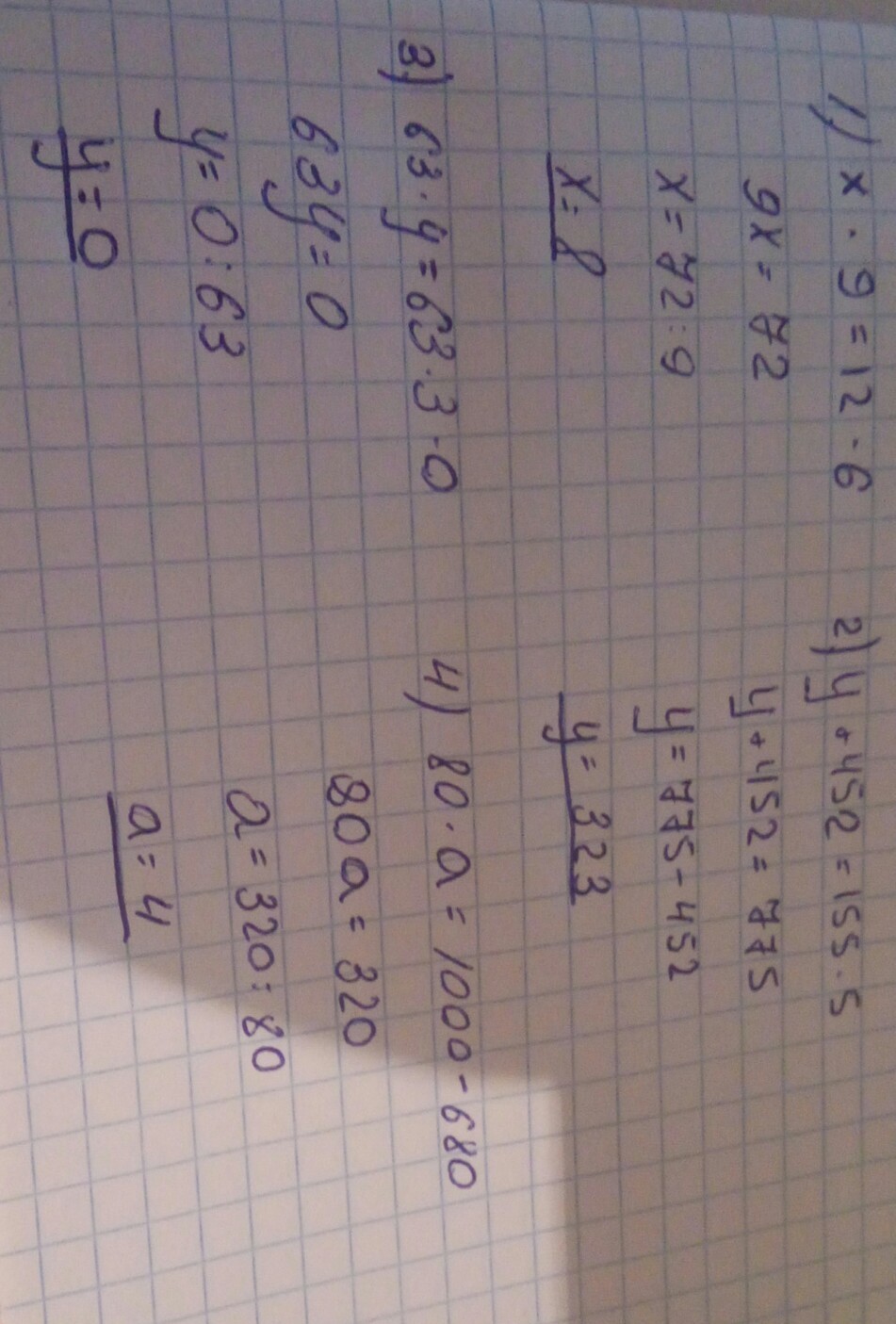 Помогите пожалуйста решить уравнения!!! х*9=12*6,y+452=155*5,63*y=63*3*0,80*а=1000-680?