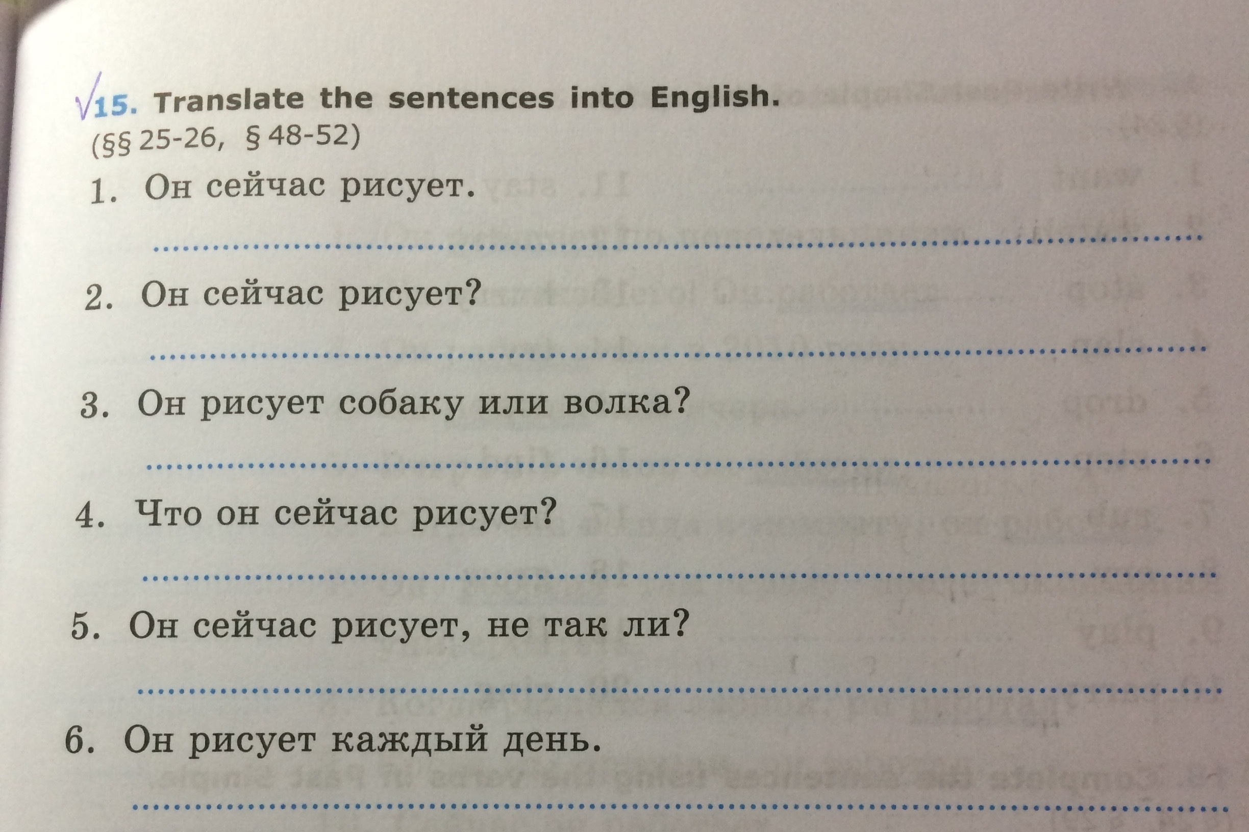1. He is now drawing. 2. Is he drawing now? 3. Does he draw a dog or a wolf? 4. What is he drawing now? 5. He's drawing now, is not he?6. He draws every day.