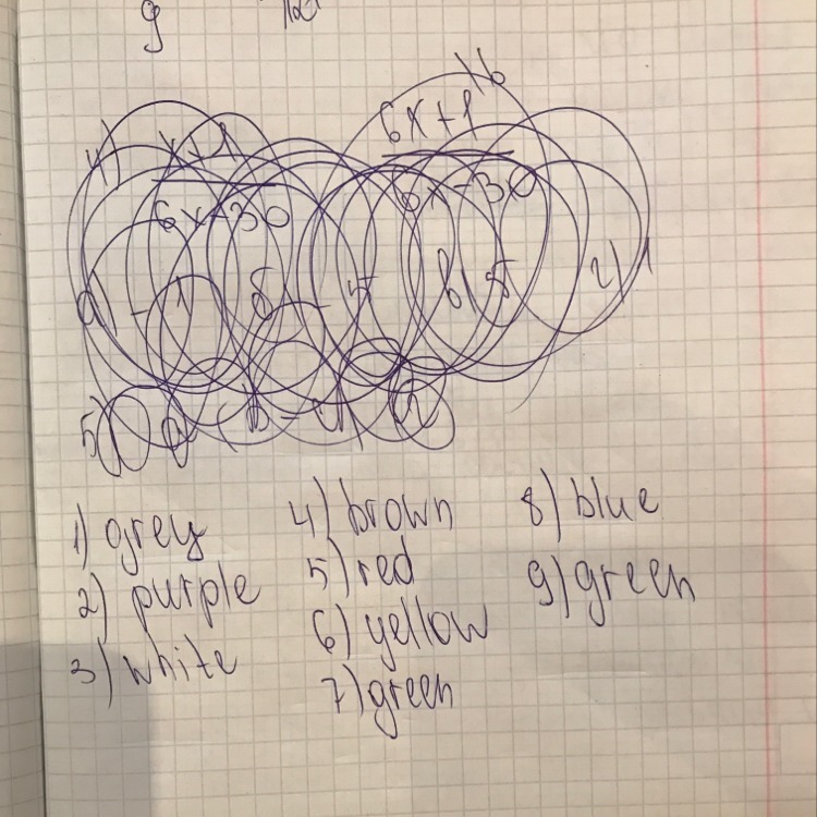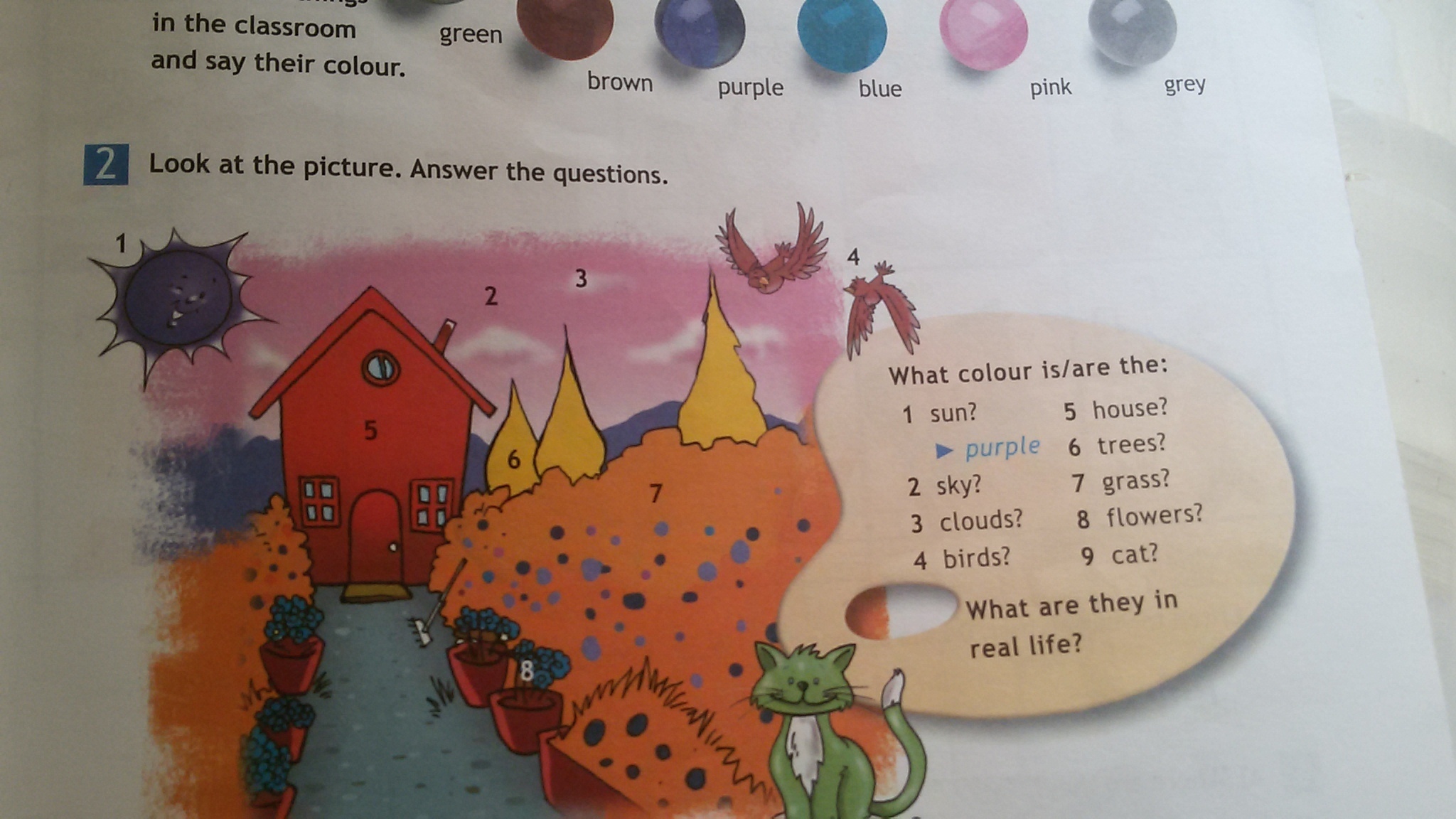the sun is purple the hous is red the sky is pink the clouds are white the birds are red the cat is green the grass is gray the trees are yellow the flowers are blue