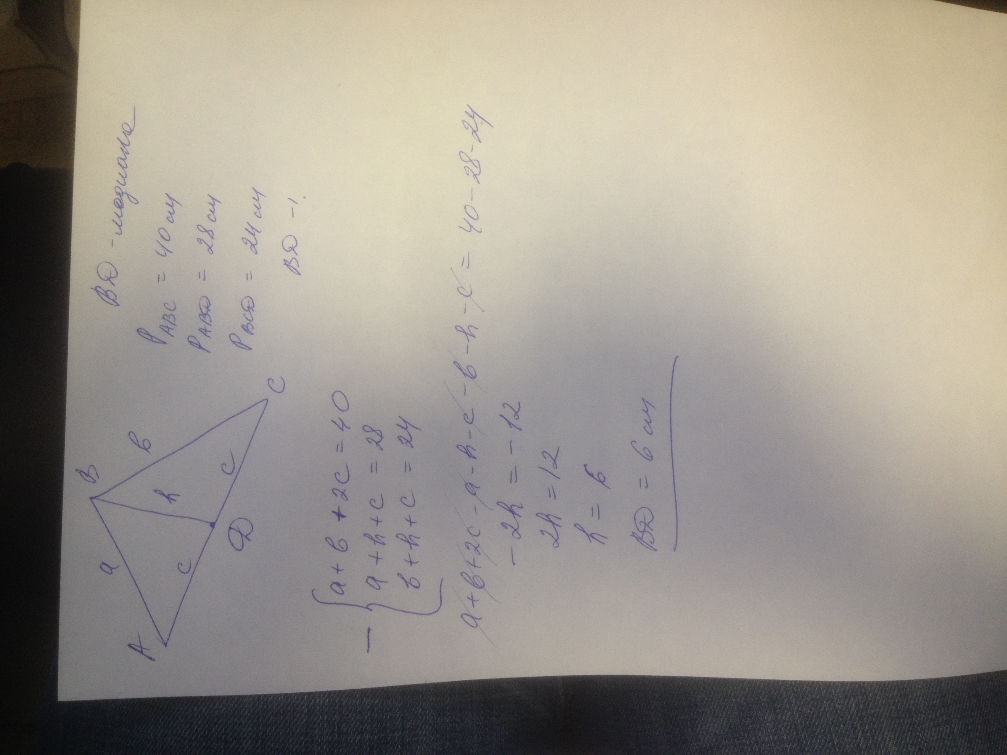 Дан треугольник ABC. BD- медиана. Периметр треугольника АВС = 40 см. Периметр треугольника АВD=28см. Периметр треугольника ВСD=24см. Найти: ВD.