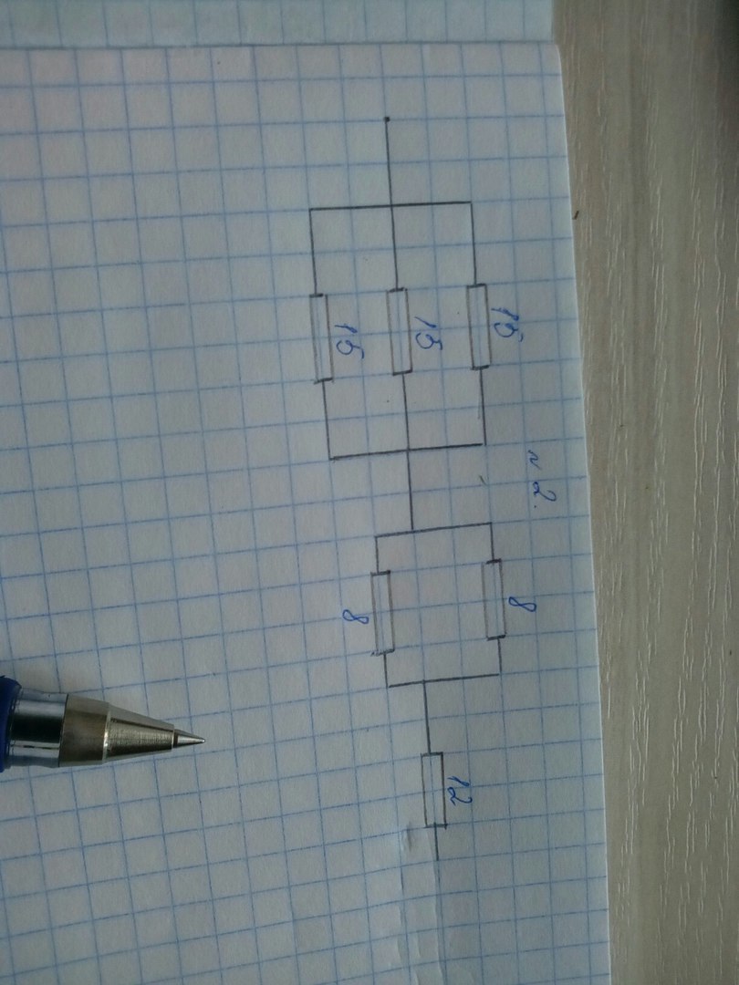1) Три параллельно соединённых резистора по 15 Ом. Общее сопротивление: