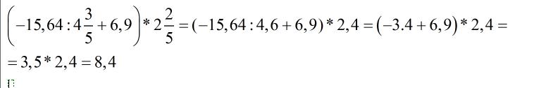 Упростить:(-15,64:4 frac{3}{5} +6,9)*2 frac{2}{5}