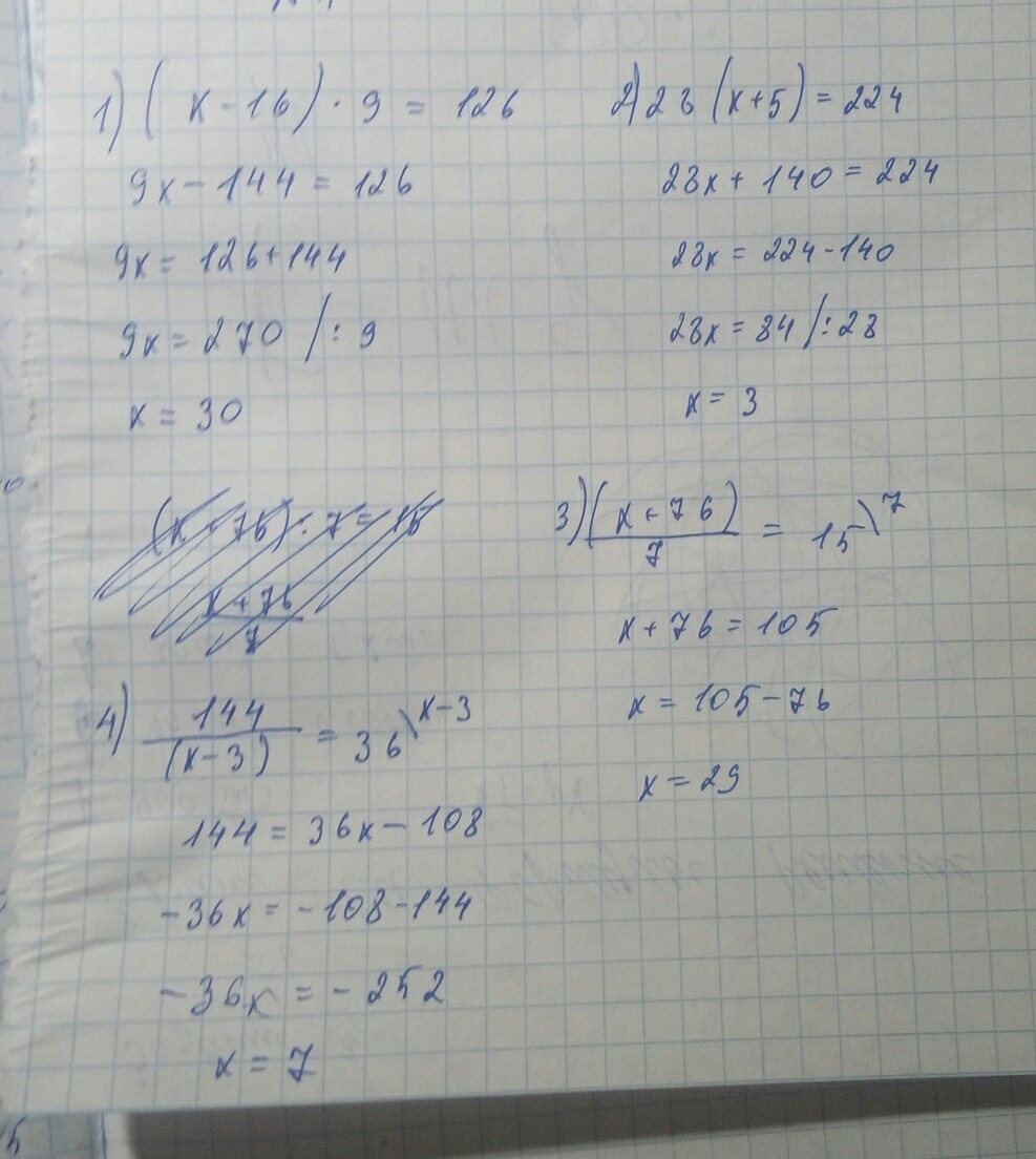 решите уравнения: (х-16)*9=126, 28*(х+5)=224, (х+76)/7=15, 144/(х-3)=36, 21*(у-8)=84, (х+67)/18=4