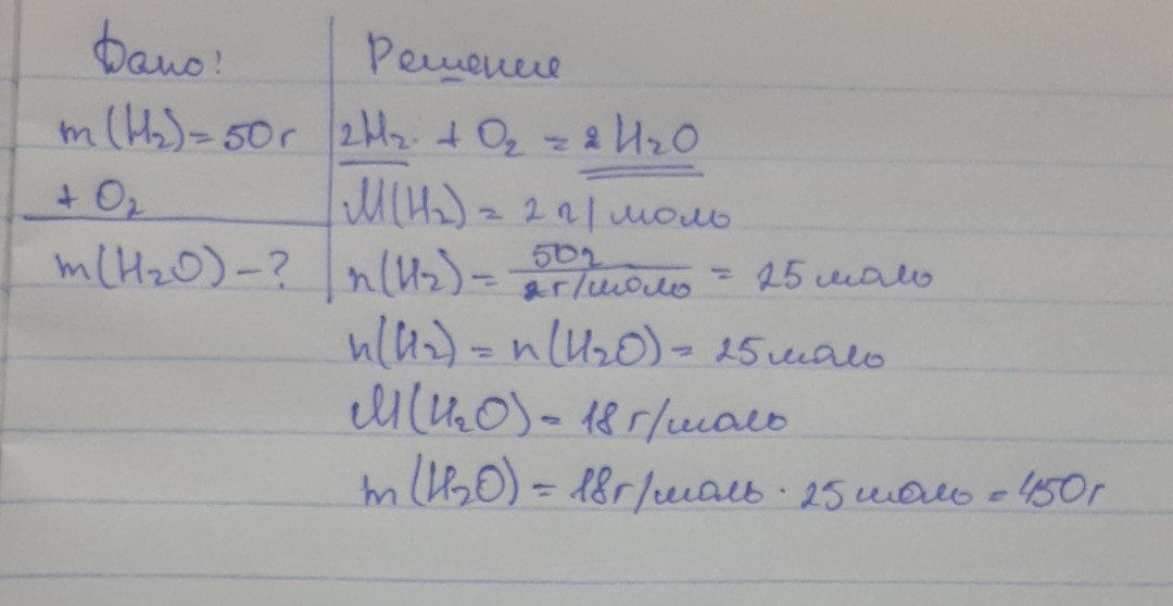 Определить массу воды если сгорело 50гр водорода. Пожалуйста, можно решение подробно. Заранее спасибо.