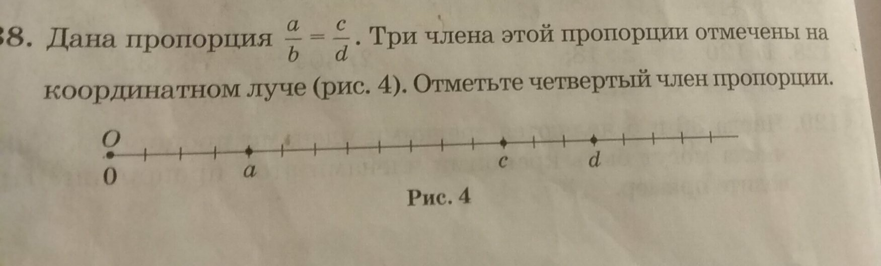 дана пропорция a/b=c/d. Три члена этой пропорции отмечены на координатном луче(рис.4). Отметьте четвертый член пропорции