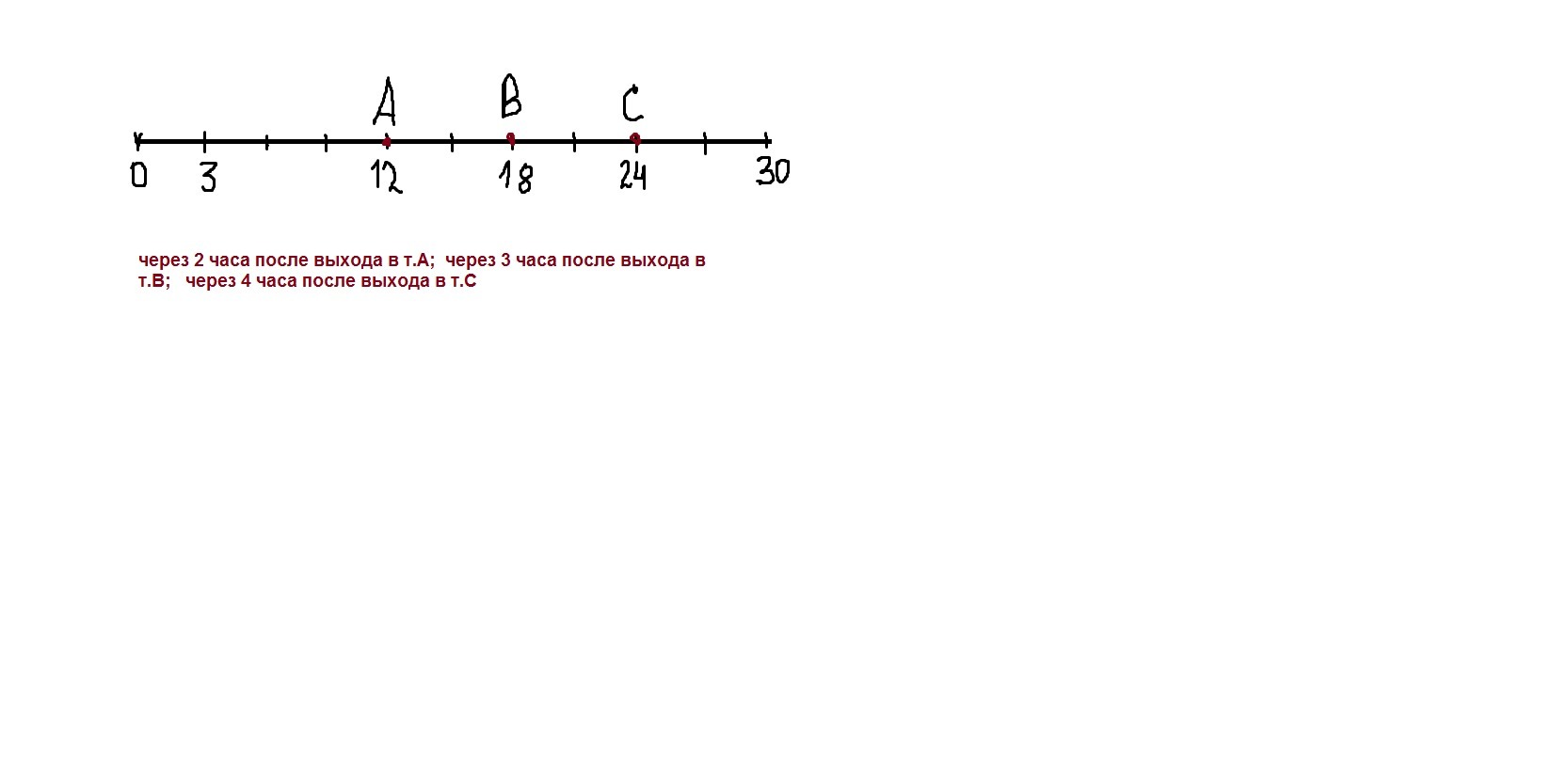 расстояние между деревнями Ельнино и Сосновка равно 30 км. изобразите дорогу между этими деревнями в виде шкалы деление которой обозначает 3 км покажите на этой шкале где окажется пешеход идущий из Ельнино в Сосновку со скоростью 6 км в час через 2 часа после выхода покажите где он окажется через 3 часа после выхода через 4 часа через 5 ч