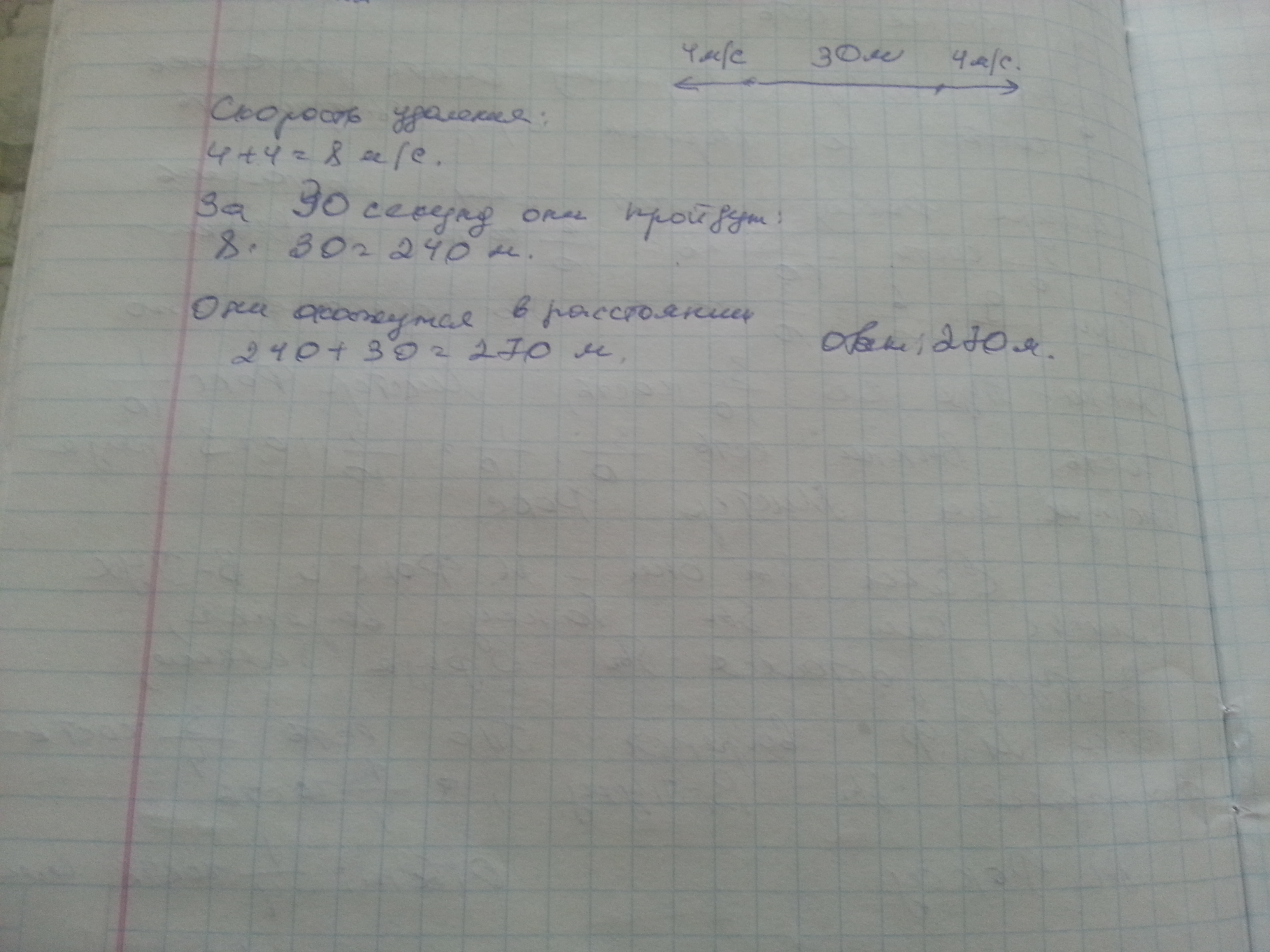 Расстояние Между двумя муравейниками 30 м. Из этих муравейников одновременно вылезли 2 муравья и побежали в противоположных направлениях со скоростью 4 м/с. На каком расстоянии они окажутся через 30с?(помогите мне с задачей по математике)<strong></strong>