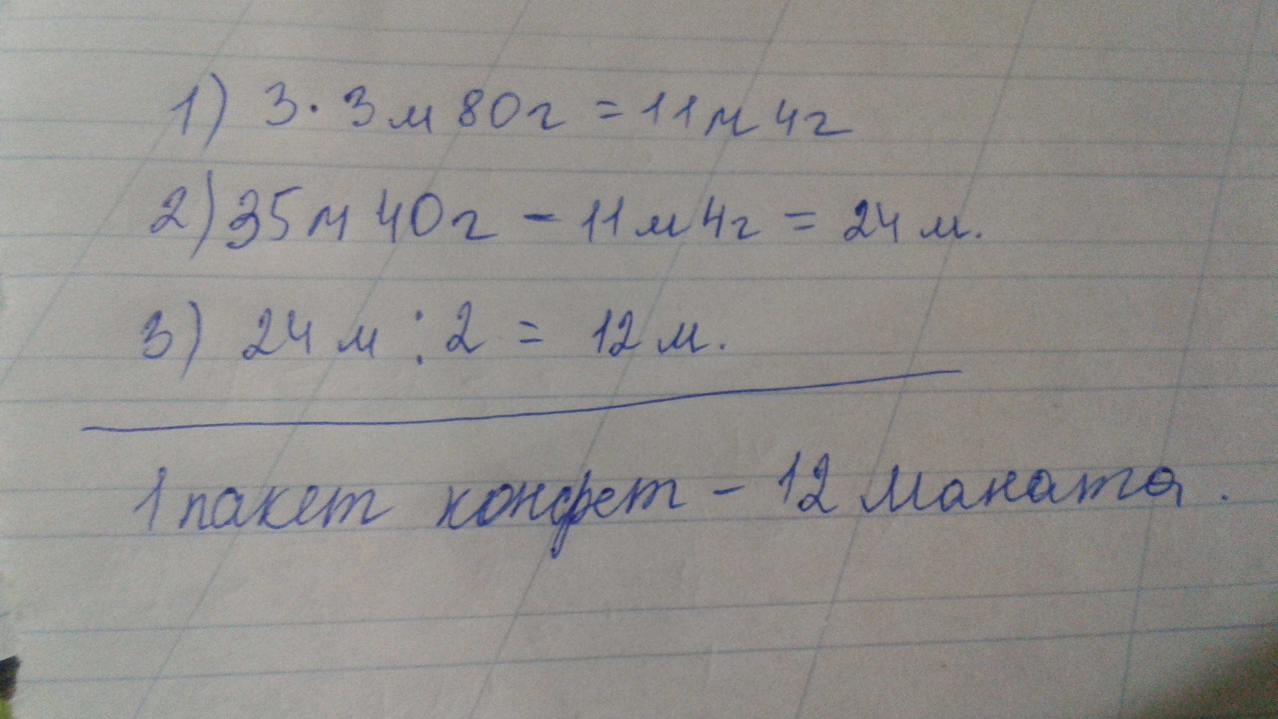 за три пачки печенья и 2 пакета конфет заплатили 35 манатов 40 гяпик.Сколько стоит один пакет конфет,если пачка печенья стоит 3 маната 80 гяпик?