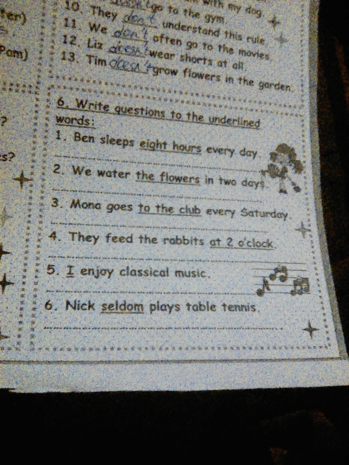 1 How long does Ben sleep every day? 2 What do you water in two days? 3 Where does Mona go every Saturday? 4 When do they feed the rabbits? 5 Who enjoys classical music? 6 How often does Nick play tennis?