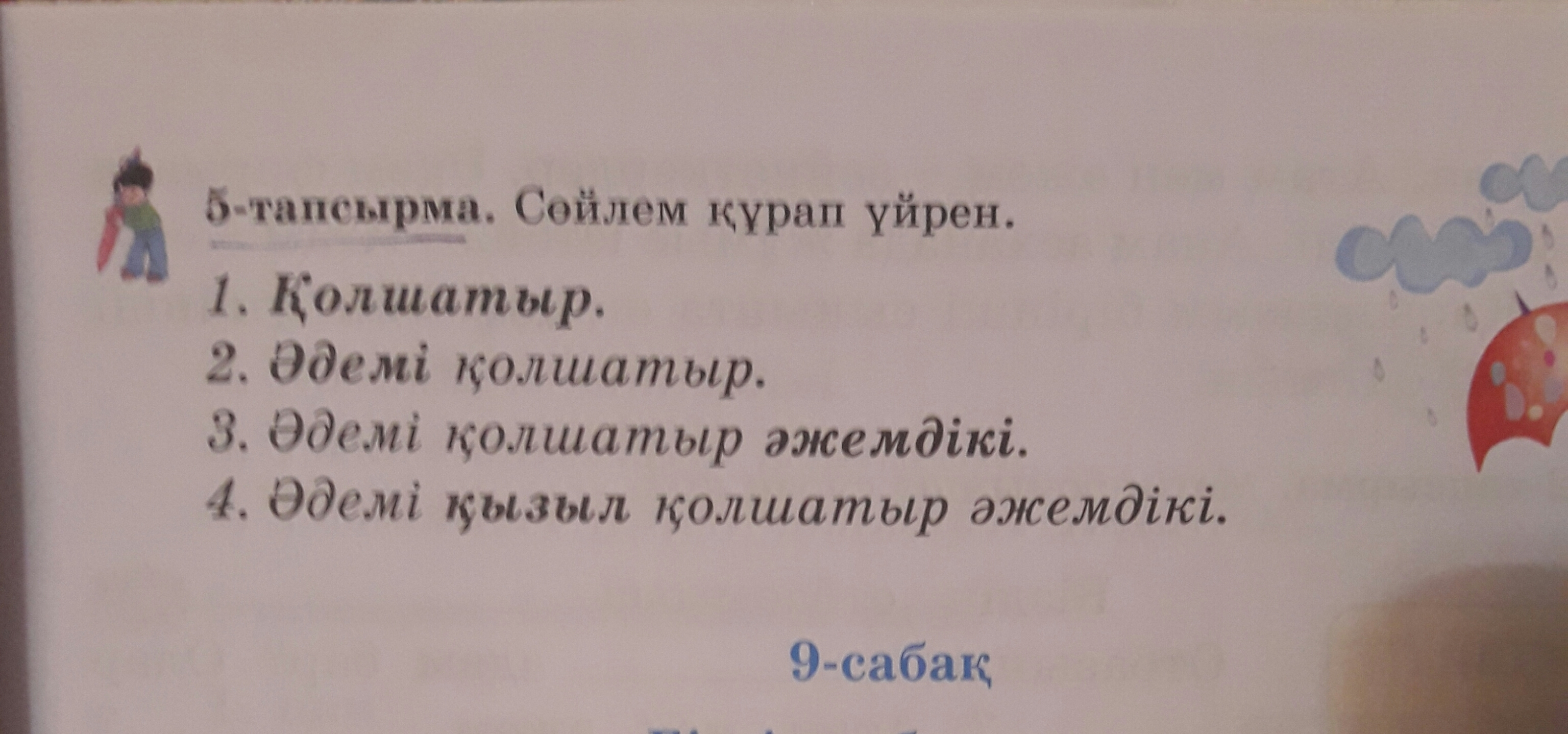 ну ты там просто учишься составлять предложения например слово қолшатыр (зонтик)