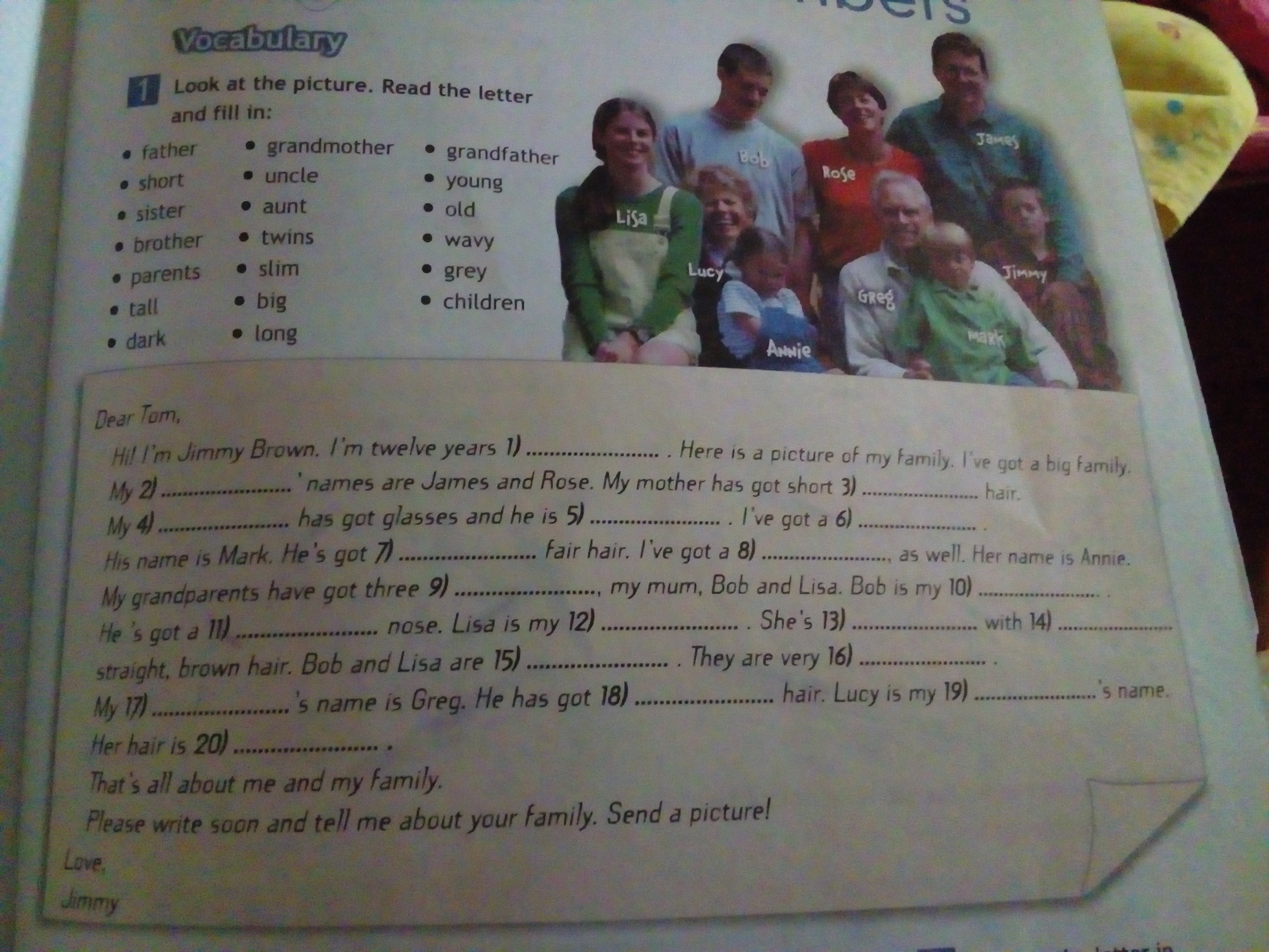 1. Old 2. Parents 3. Dark 4. Father 5. Tall 6. Brother 7. Short 8. Sister 9. Children 10. Uncle 11. Big 12. Aunt 13. Slim 14. Long 15. Twins 16. Young 17. Grandfather 18. Grey 19. Grandmother 20. Wavy