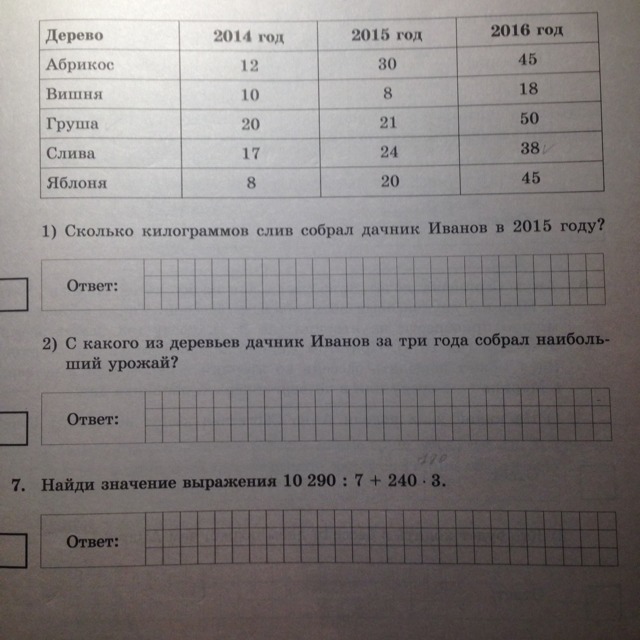 1)24 сливы в 2015 году собрал дачник,2) дерево груши, 7)10290:7--1470,240*3--720,720+1470--2190 .Это точно всё правильно я проверяла на калькуляторе!
