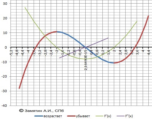 F'(x) = 2*x² - 8 = 2*(x-2)*(x+2) < 0 между корнями - функция убывает