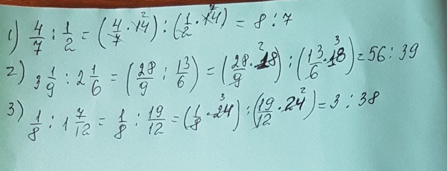 используя свойство отношений,замените отношения дробных чисел равных ему отнршением натуральных чисел: 4/7:1/2,3 1/9:2 1/6,1/8:1 7/12