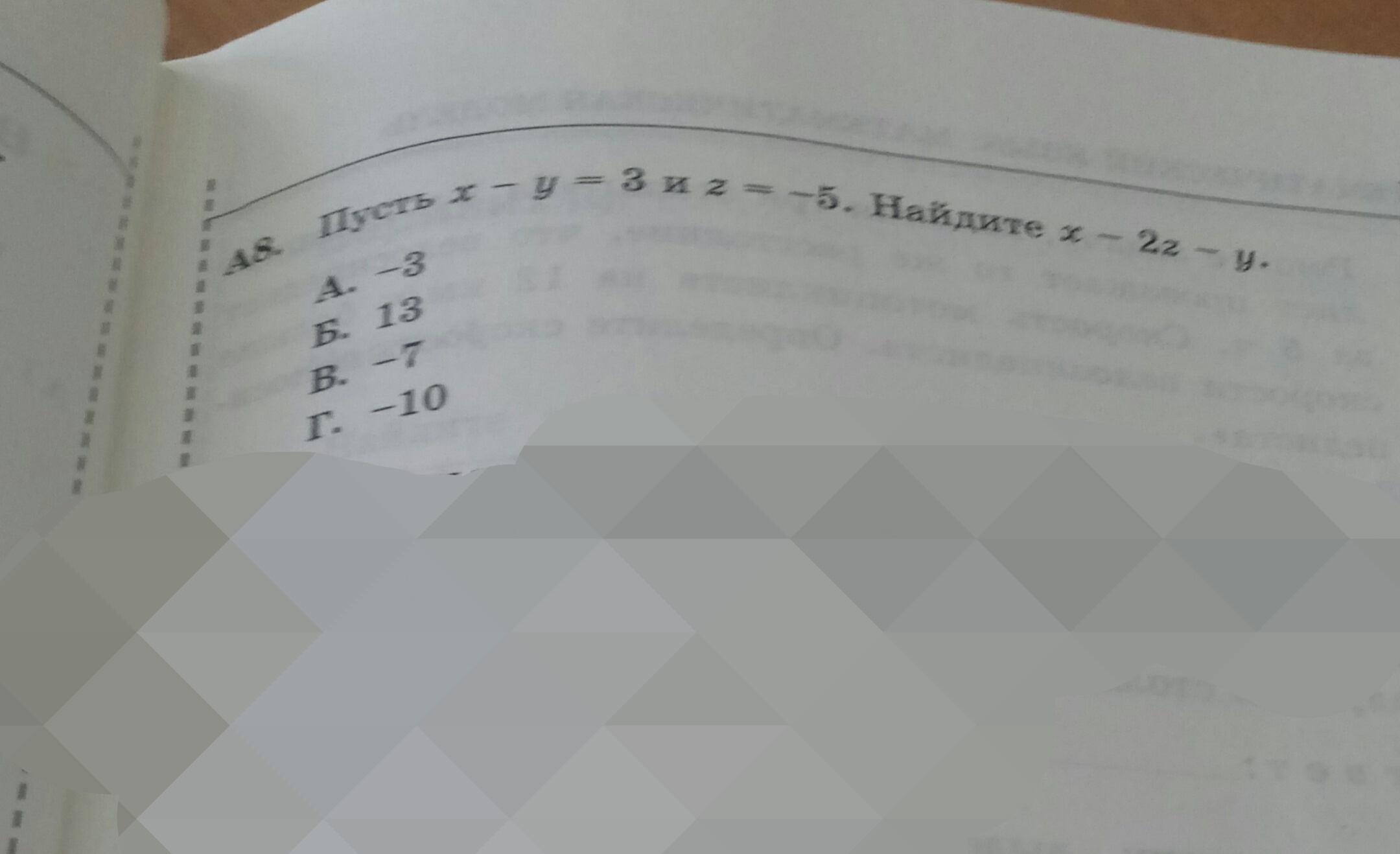 x-2z-y=(x-y)-2z. подставляем значения: 3-2*(-5)=3+10=13. Ответ: буква Б).