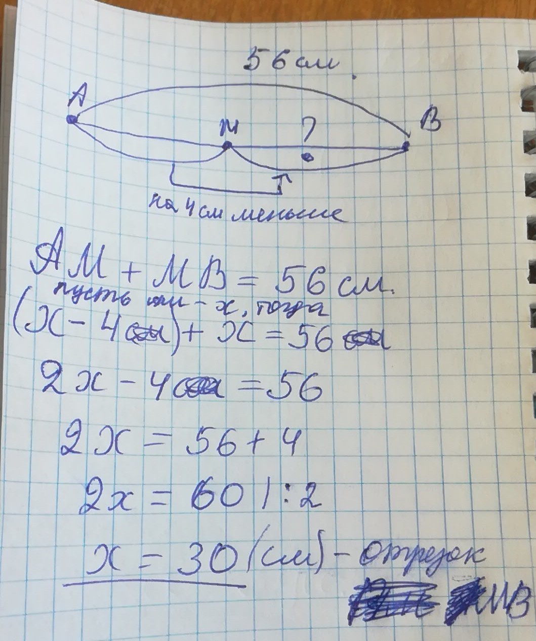 На отрезки AB, равном 56 см, взята точка М. отрезок AM на 4 см меньше отрезка MB. Найдите длину отрезка BM.