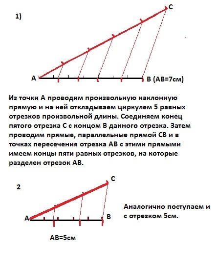 1) Из точки А отрезка АВ, равного 7 см проводим произвольную наклонную прямую и на ней откладываем циркулем 5 равных отрезков произвольной длины. Соединяем конец пятого отрезка С с концом В данного отрезка. Затем проводим прямые, параллельные прямой СВ и в точках пересечения отрезка АВ с этими прямыми имеем концы пяти равных отрезков, на которые разделен отрезок АВ.2) Аналогично поступаем и с отрезком 5см.