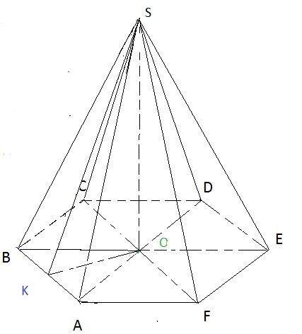 Теперь рассмотрим прямоугольный треугольник SOK. SK - апофема пирамиды, OK - радиус вписанной окружности основания.