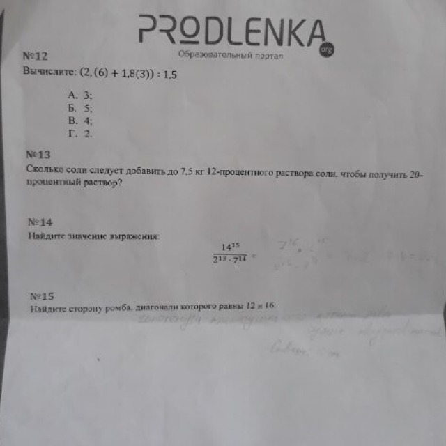 15) диагональ 12- значит одна ее часть 6, другая диагональ 16 - её половина 8. Возьмем прямоугольный треугольник с катетами 8 и 6, по теореме Пифагора 64+32=100 и корень из 100= 10, 10- это сторона ромба, все его стороны будут ровняться 10. Ответ:10